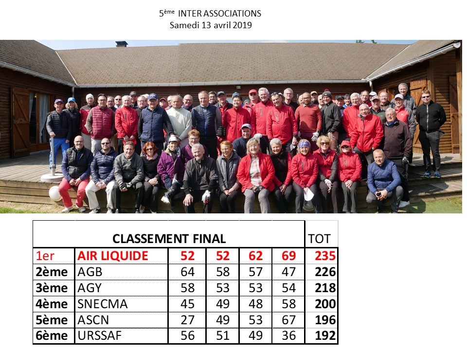 5ème INTER ASSOCIATIONS sur le golf de Chevannes Mennecy ou l'accueuil était comme les années précédentes au rendez-vous. Si le parcours pouvait être en meilleur état ce serait parfait, mais bon. Comme l'an dernier l'AIR LIQUIDE trute les première place, en individuel et par asso, un grand bravo à eux, mais l'an prochain nus surveillerons de plus près les index.......surtout ceux obtenus à l'étranger.......